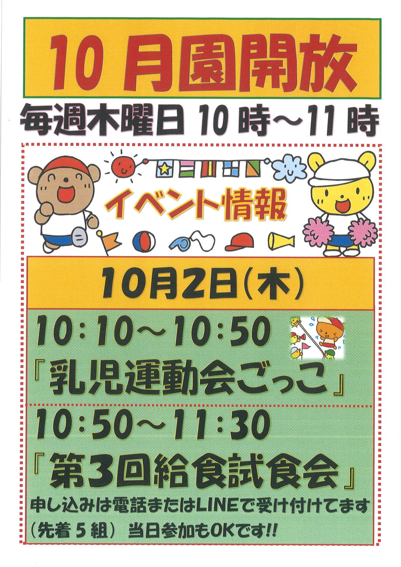 10月はお楽しみイベントが続きます。3日はバルーンショー。17日は乳児さんの運動会ごっこで沢山体を動かしましょう。その後は、当園自慢の手作り給食をご試食いただく機会を設けました。当園では独自献立でボイルパックや調理済み品などを使用せず地場産のおいしい食材で、素材のおいしさを引きだす調理法で美味しい給食を提供しています。ぜひお子様とご参加ください。
