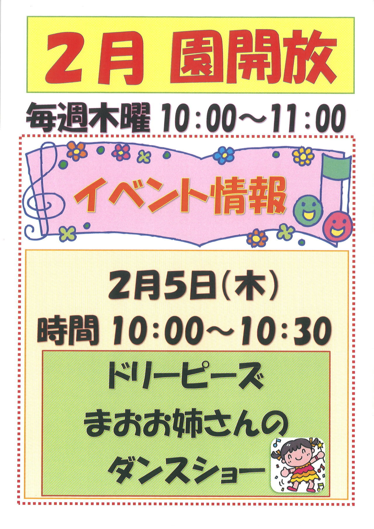 2月のイベント案内です。ドリーピーズのダンスのお姉さんが来てくれます。