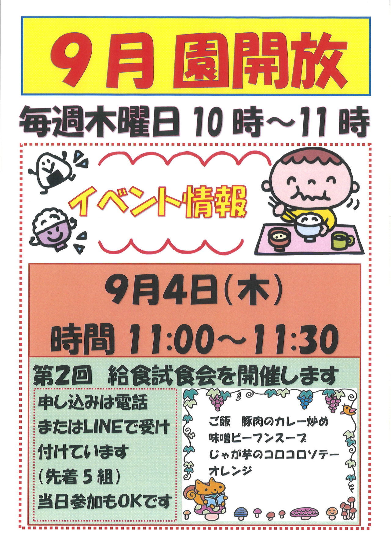 最終週は今年度1回目の当園自慢の給食をご試食いただく「給食試食会」を開催します。先着5組ですので、ご希望の方は早めにお申し込みください。