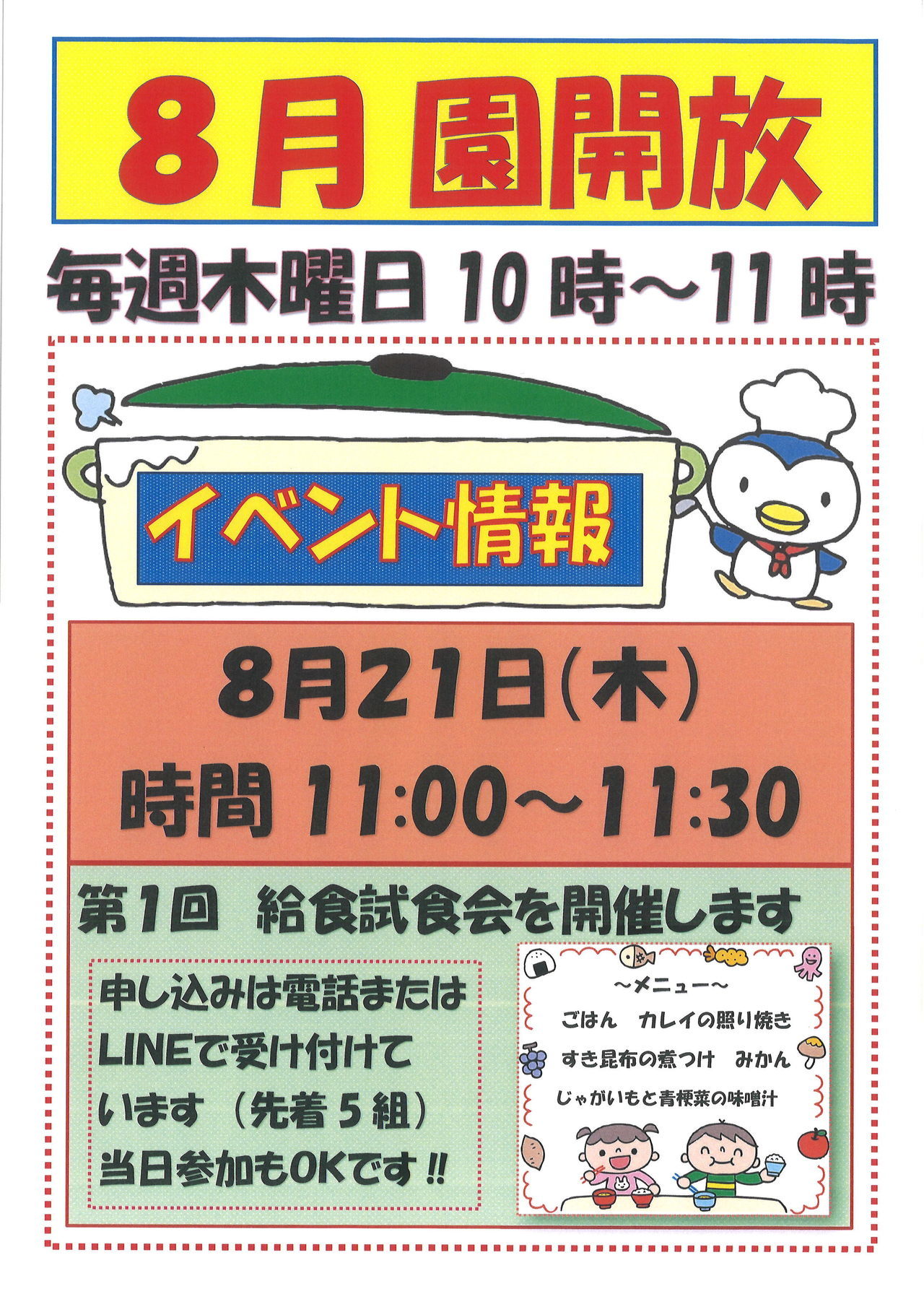 そろそろ入園する園を決める時期ということで、今月は入園説明会とともに、園自慢のおいしい給食の試食会を開催します。お子様とご一緒に試食してください。8月の試食会では、ご参加された保護者様から「いつも食べないのにお魚もご飯も食べました。美味しかったんでしょうね」と、うれしい声をいただきました。