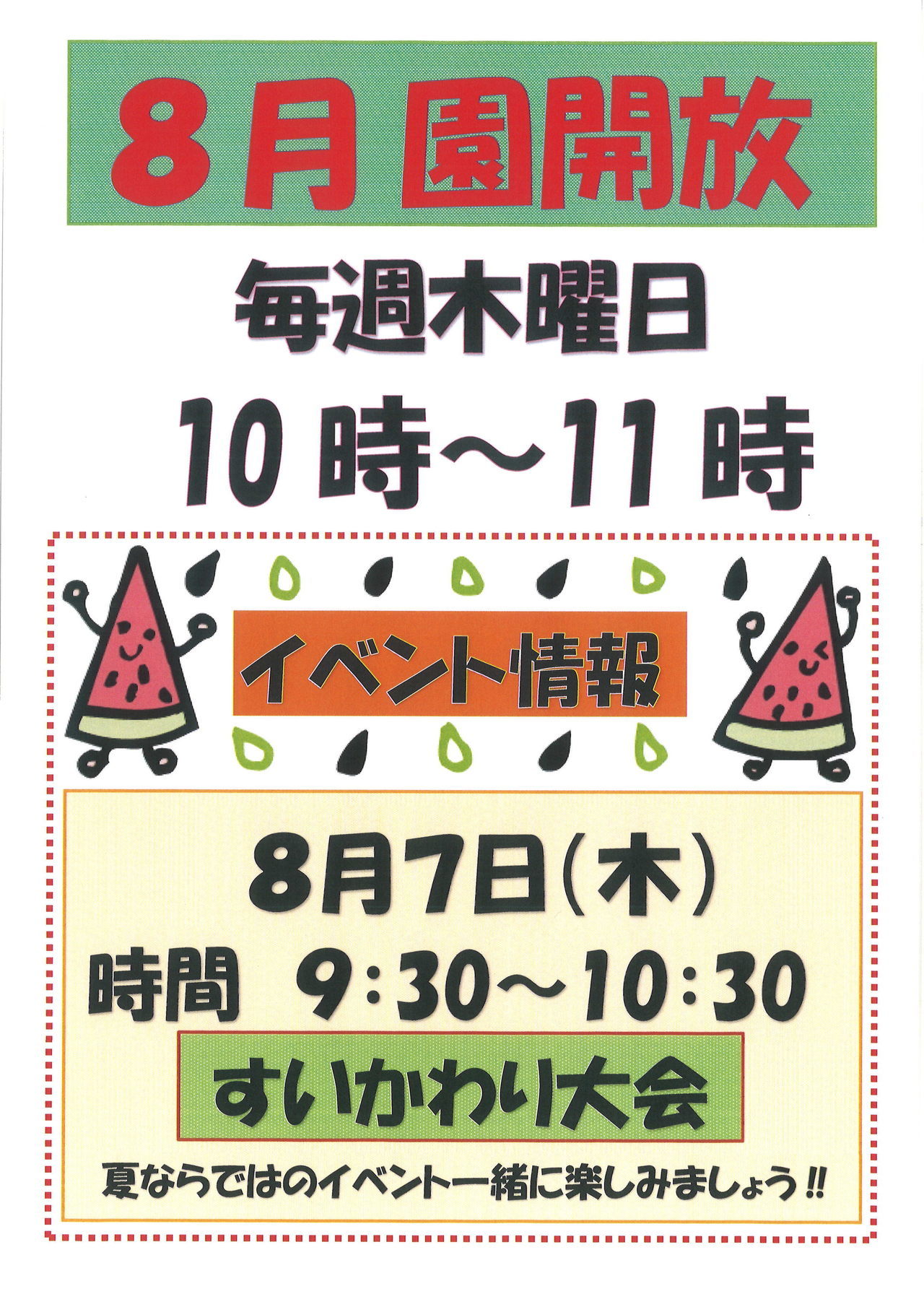 8月のイベントのお知らせです。百華保育園毎年恒例の行事「すいか割り大会」があります。すいかを割ったり食べたり一緒に楽しみませんか?参加費は無料です。